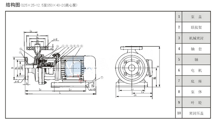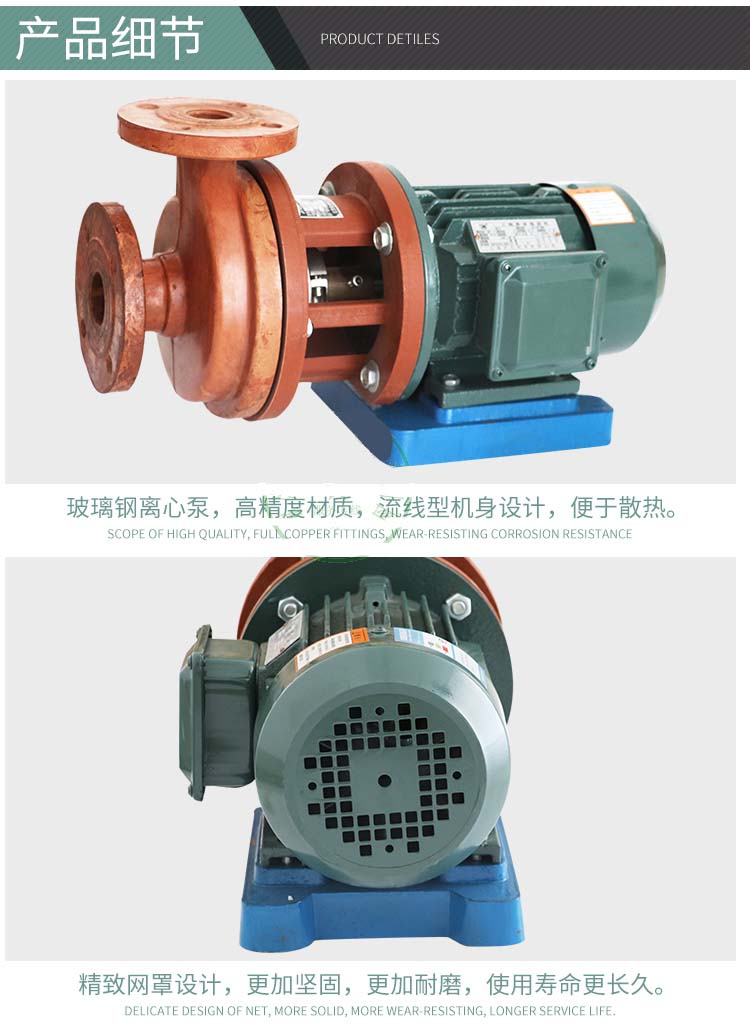 S型玻璃鋼泵,其過流部件為聚乙烯醇縮丁醛、改性酚醛玻璃纖維材料經高溫模壓而成,具有良好的耐腐蝕、耐溫性,該型泵具有重量較輕、強度較高、不易變形等特點。軸封采用機械密封。