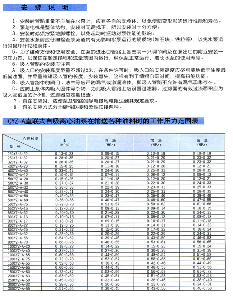 CYZ-A型自吸式直聯(lián)自吸油泵該自吸泵適用于石油行業(yè)、陸地油庫、油罐車的理想產(chǎn)品,并適合于作船用貨油泵、艙底 泵、消防泵和壓載泵及機器冷卻水循環(huán)等,分別輸送汽油、煤油、柴油、航煤等石油產(chǎn)品和海水、清水,介質(zhì)溫度-20℃-80℃,如輸送化工液體可改用耐腐蝕 機械密封。