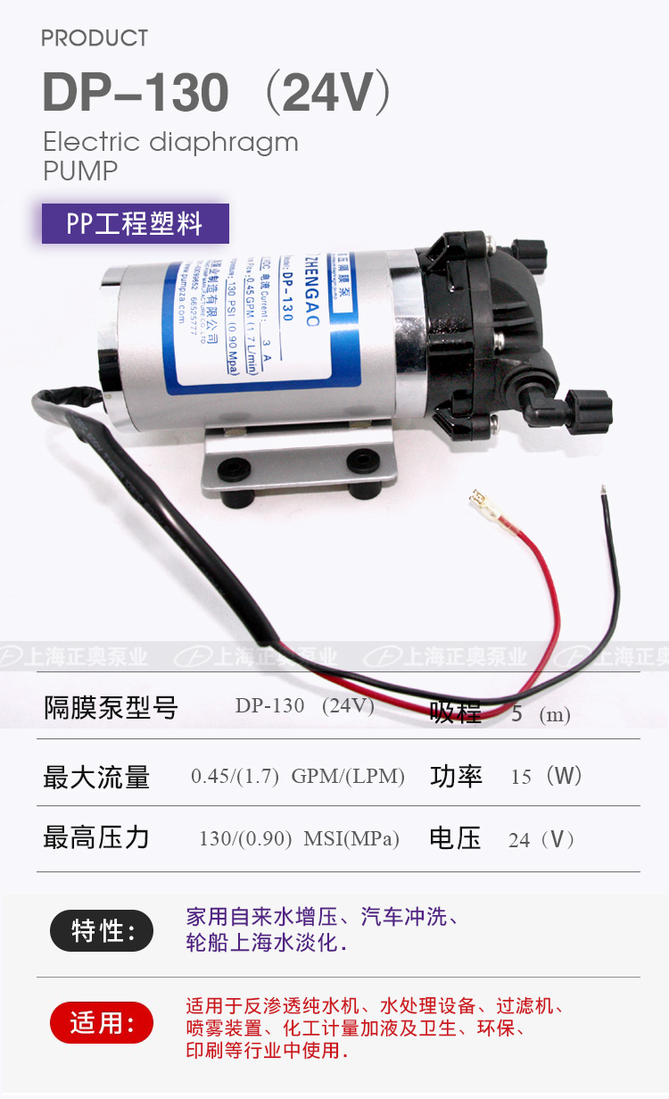 DP微型電動隔膜泵適用于家用自來水增壓、汽車沖洗、輪船上海水淡化,DP隔膜泵適用于反滲透純水機、水處理設備、過濾機、噴霧裝置、化工計量加液及衛(wèi)生、環(huán)保、印刷等行業(yè)中使用。