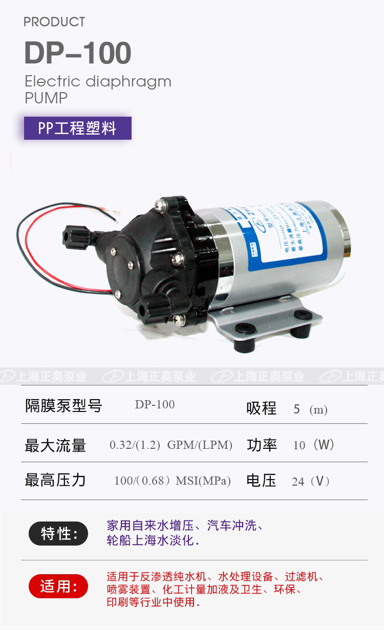 DP微型電動隔膜泵適用于家用自來水增壓、汽車沖洗、輪船上海水淡化,DP隔膜泵適用于反滲透純水機、水處理設(shè)備、過濾機、噴霧裝置、化工計量加液及衛(wèi)生、環(huán)保、印刷等行業(yè)中使用。