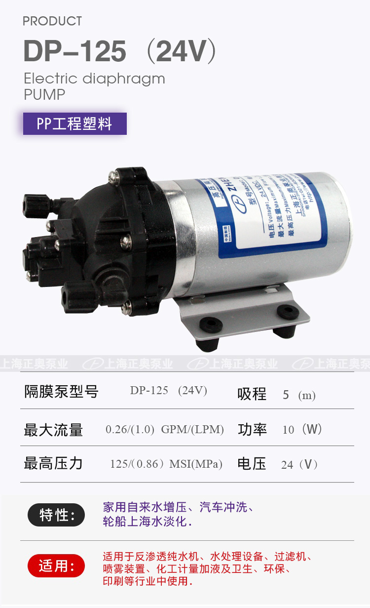 DP微型電動(dòng)隔膜泵適用于家用自來水增壓、汽車沖洗、輪船上海水淡化,DP隔膜泵適用于反滲透純水機(jī)、水處理設(shè)備、過濾機(jī)、噴霧裝置、化工計(jì)量加液及衛(wèi)生、環(huán)保、印刷等行業(yè)中使用。