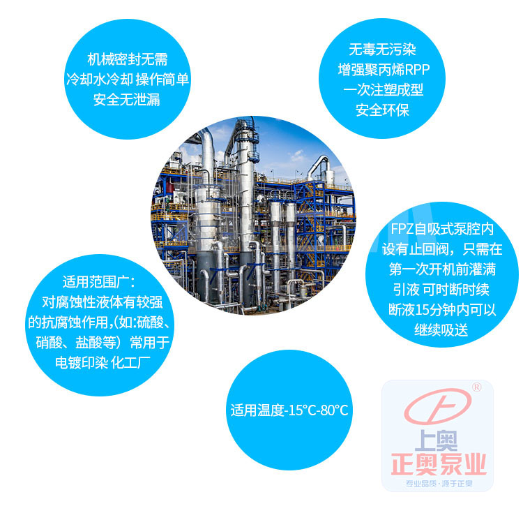 正奧公司生產(chǎn)的101型、102型、103型、104型、105型泵系單吸直聯(lián)式塑料離心泵是一種小型塑料泵,產(chǎn)品結(jié)構(gòu)、體積小、重量輕、耗電省、耐酸堿、密封好、維修方便。FS型工程塑料離心泵系列產(chǎn)品均采用機(jī)械密封,并引進(jìn)國(guó)際工藝和技術(shù)配方,全使用改性ABS(工程塑料)作為泵的材質(zhì),在同系列的塑料泵產(chǎn)品中,充分顯示了其結(jié)構(gòu)重量輕、體積小、壽命長(zhǎng)等特點(diǎn),廣泛應(yīng)用于化工,食品、制藥、電鍍、造紙、環(huán)保、水處理等部門,輸送酸、堿、鹽等腐蝕性液體。其中104型采用220V電壓,可供家庭選用。