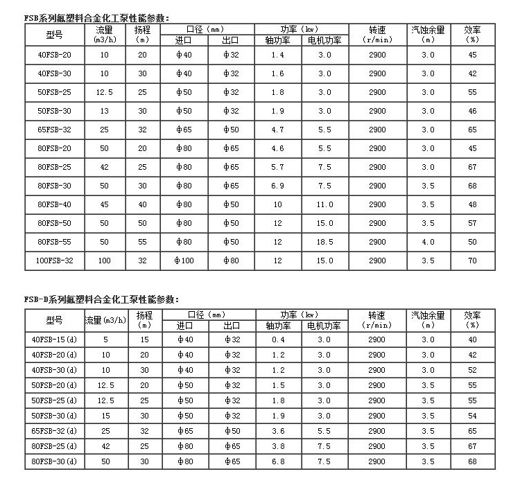 FSB型氟塑料合金離心泵氟塑料合金離心泵是按照國家標準設(shè)計,適用于長期輸送任意濃度的強酸、堿、鹽、強氧化劑等多種腐蝕性介質(zhì),其殼體及過流部件全部用塑料合金(PTFE、FEP)制成,集多種塑料泵之優(yōu)點,具有耐腐蝕性強、耐磨性好、機械強度高、不氧化、無毒素分解特點。分為長支架軸聯(lián)式和短支架直聯(lián)式兩種結(jié)構(gòu)形式,設(shè)計合理,結(jié)構(gòu)緊湊,性能可靠,使用維修方便,流道光滑效率高,節(jié)約能源。