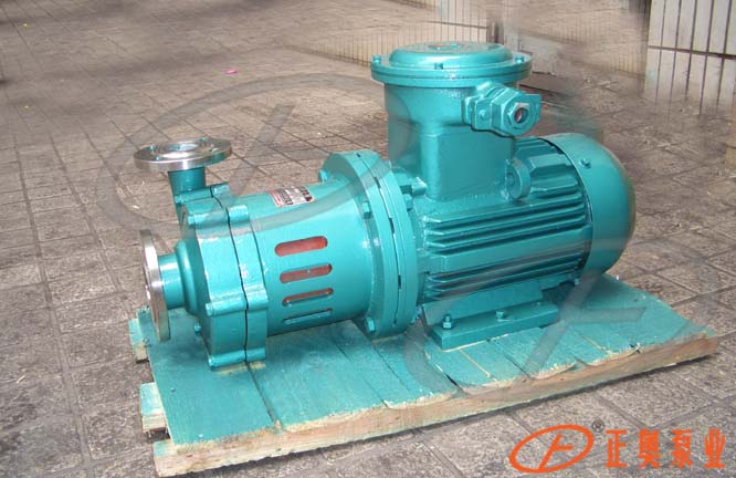 CQG型耐高溫磁力驅(qū)動(dòng)泵(耐溫≤250℃)(簡(jiǎn)稱(chēng)磁力泵)通常由電機(jī),磁力偶合器水冷卻裝置和耐腐蝕離心泵四大部分組成,其主要特點(diǎn)是利用磁力偶合器傳遞動(dòng)力,完全無(wú)泄漏。當(dāng)電動(dòng)機(jī)帶動(dòng)磁力偶合器的外磁鋼旋轉(zhuǎn)時(shí),磁力線穿過(guò)了間隙和隔離套,作用與內(nèi)磁鋼上,使泵轉(zhuǎn)子與電動(dòng)機(jī)同步旋轉(zhuǎn),無(wú)機(jī)械接觸地傳遞扭矩。在泵的動(dòng)力輸入端,由于液體被封閉在靜止的隔離套內(nèi),沒(méi)有動(dòng)密封因而無(wú)泄漏,磁力偶合器的磁性材料采用了高溫介質(zhì)而保持強(qiáng)大的磁力扭矩。在電機(jī)與磁力偶合器之間加裝了水冷卻裝置,防止泵送高溫介質(zhì)之熱量傳導(dǎo)至電機(jī)。以保持電機(jī)的正常運(yùn)轉(zhuǎn),從而達(dá)到無(wú)泄露輸送高溫介質(zhì)。