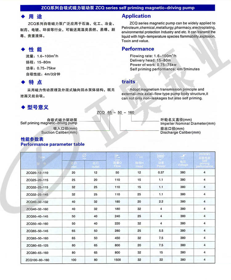 上奧牌ZCQ型自吸式磁力驅(qū)動(dòng)泵(以下簡稱自吸泵)該泵以靜密封取代動(dòng)密封,使泵的過流部件處于完全密封狀態(tài),解決了其它泵機(jī)械密封無法避免的跑、冒、滴、漏之弊病,泵體及過流部件的材料均采用了耐腐蝕的不銹鋼、鋼玉陶瓷、四氟石墨等材料制造,既有CQ型磁力驅(qū)動(dòng)泵的功能,又集皂吸于一身,不需底閥和引灌水,自吸高度4米。