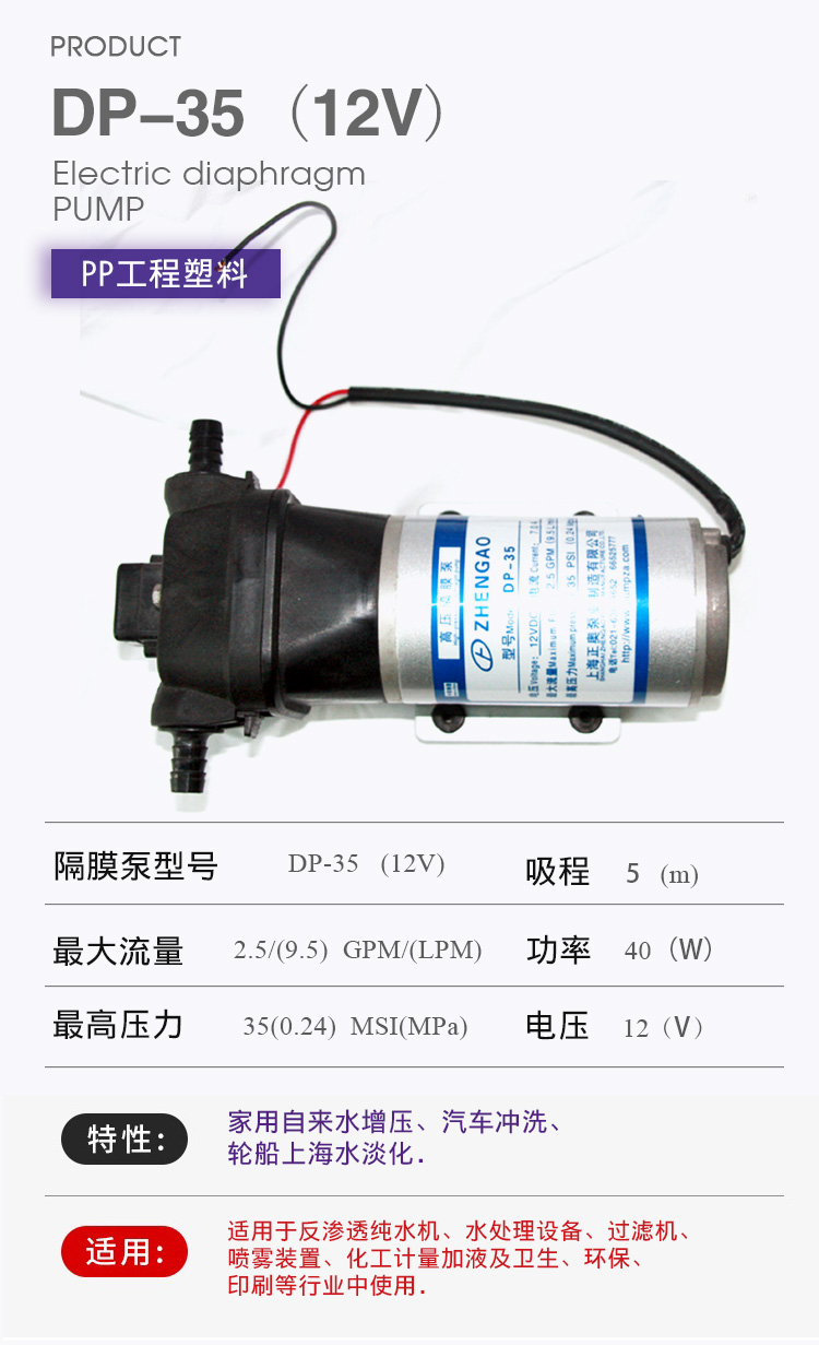 DP微型電動(dòng)隔膜泵適用于家用自來(lái)水增壓、汽車(chē)沖洗、輪船上海水淡化,DP隔膜泵適用于反滲透純水機(jī)、水處理設(shè)備、過(guò)濾機(jī)、噴霧裝置、化工計(jì)量加液及衛(wèi)生、環(huán)保、印刷等行業(yè)中使用。