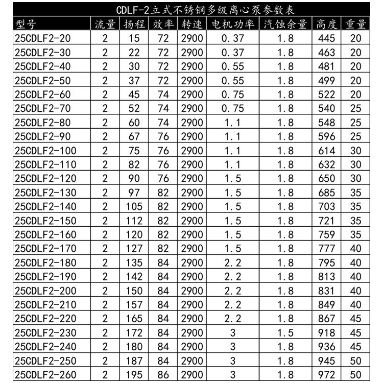 CDLF-2不銹鋼立式多級(jí)泵性能參數(shù)選型: